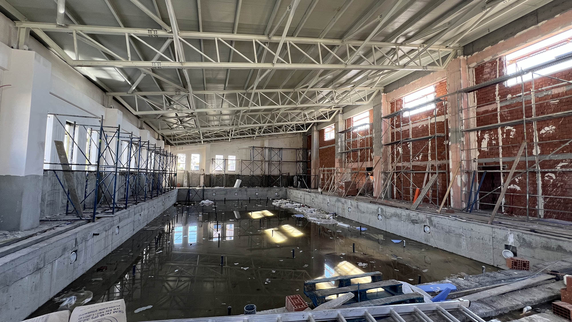 4 bin metrekare alan üzerine inşa edilen yarı olimpik yüzme havuzunda betonarme ve çelik çatı imalatları tamamlandı. Duvar örme işlemleri bitirilen havuz bölümünde dış sıva ve mantolama çalışmaları ise devam ediyor.