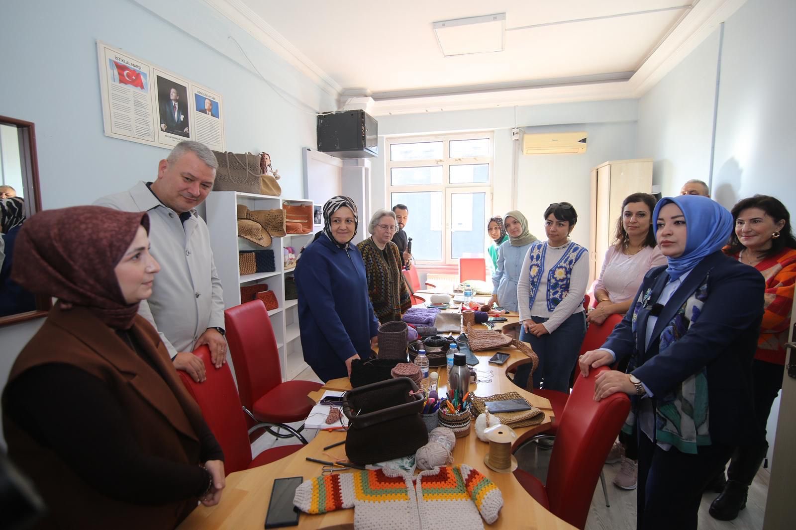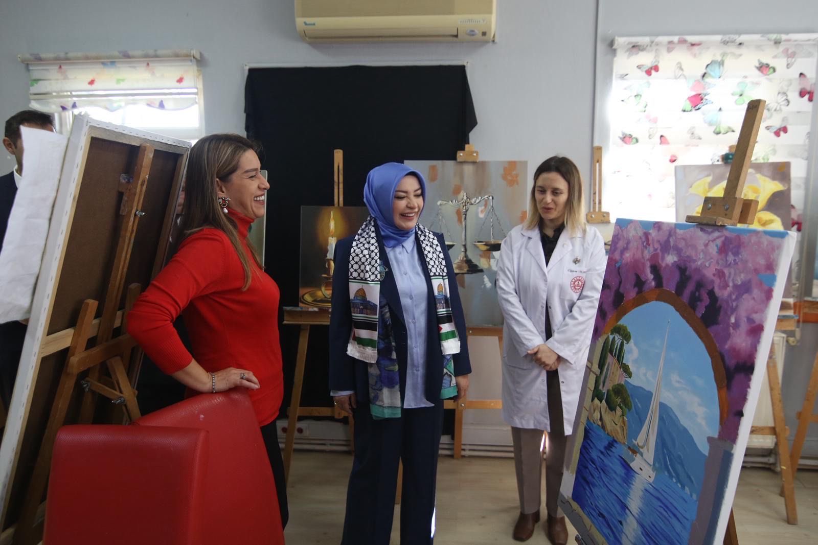 Kursiyerlerin çiçeklerle karşıladığı Çiğdem Erdoğan; Kağıt Rölyef, Ahşap Yakma, Resim, El Sanatları ve Ahşap Boyama kurslarını ziyaret ederek kursiyerlerle etkinlik yaptı, sohbet etti.