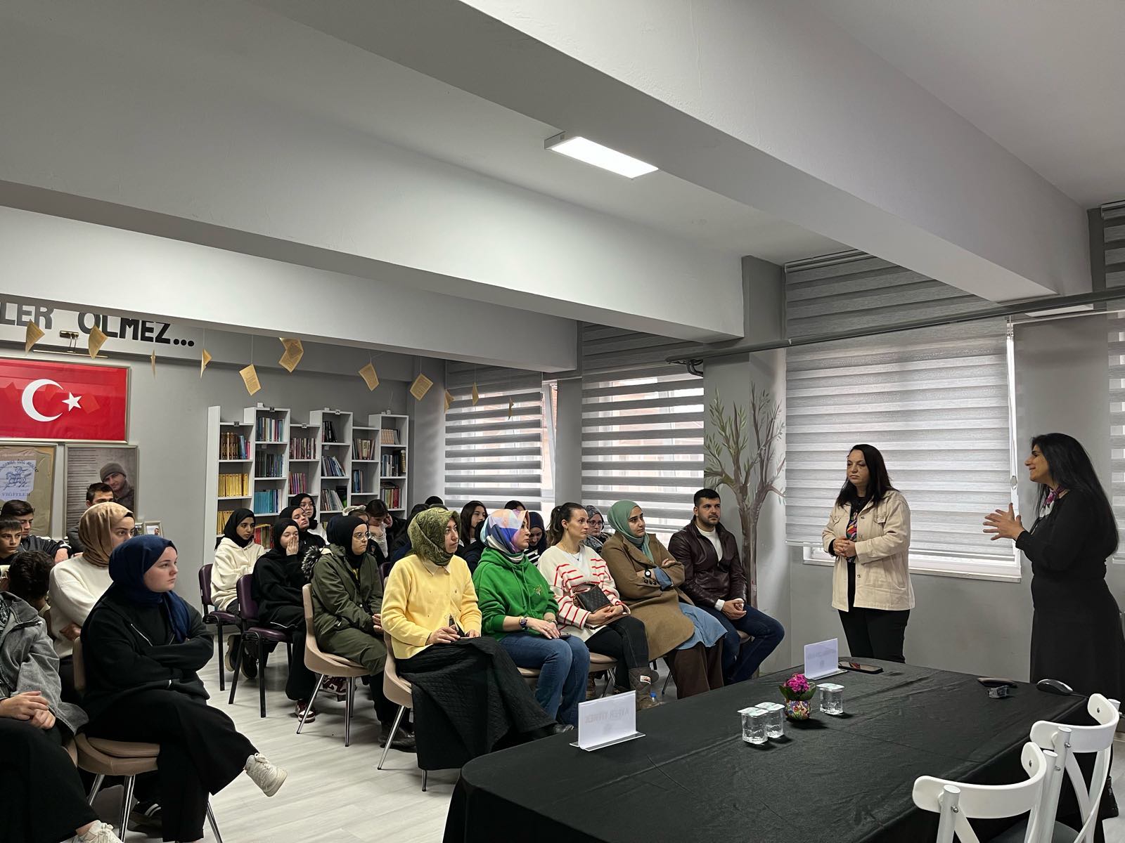 Okul kütüphanesinde yapılan programda, öğrencilerin meslek tercih süreçlerine katkı sunmak amacıyla sağlık sektörünün farklı branşları ele alındı; alanın çalışma koşulları, eğitim süreçleri ve mesleki sorumlulukları hakkında bilgilendirmelerde bulunuldu. Program kapsamında sağlık hizmetleri alanında yer alan ebelik, hemşirelik, fizyoterapi, acil tıp teknikerliği (ATT), dil ve konuşma terapistliği, diyetisyenlik başta olmak üzere birçok meslek tanıtıldı. Öğrencilerin bu alanlara yönelik merak ettikleri konulara açıklık getirilirken, mesleklerin toplum sağlığına sunduğu katkılar, ekip çalışması ve etik sorumluluklar üzerinde duruldu.