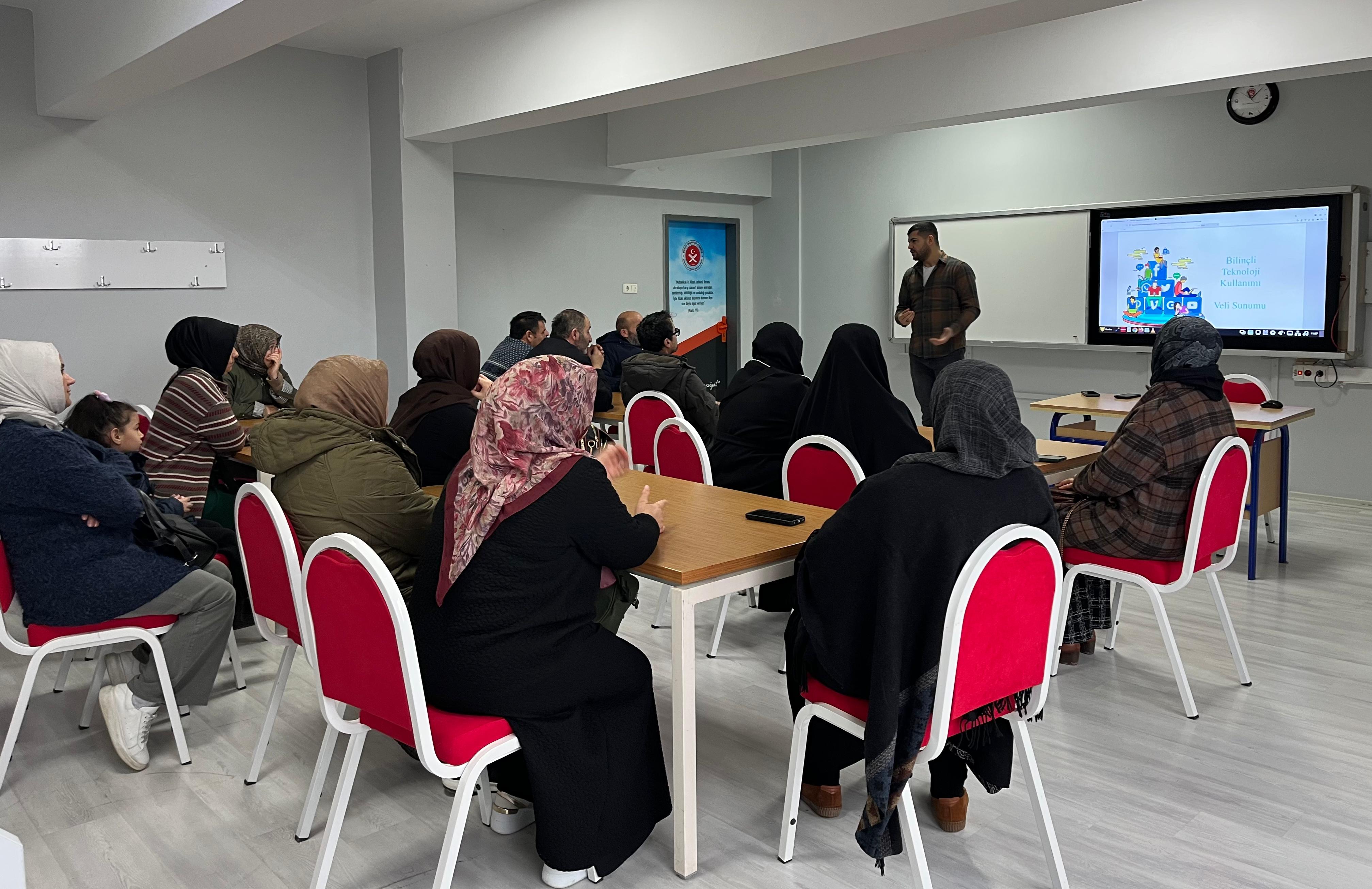 .ile Yılı vurgusuyla düzenlenen eğitim, Okul Psikolojik Danışmanı Adem Kaldan tarafından verildi ve velilerin aile içi iletişim ile dijital dünyaya dair bilinç düzeylerini artırmaya yönelik başlıklar ele alındı. Programda, “Teknoloji ve Medya Kullanımı” başlığı altında dijital bağımlılık farkındalığı, güvenli internet kullanımı ve ebeveyn denetimi konularında velilere rehberlik edildi. Günümüz aile yapısını doğrudan etkileyen dijital risklere karşı velilerin bilinçli rehberliğinin önemi vurgulanırken, pratik önerilerle farkındalık oluşturuldu.