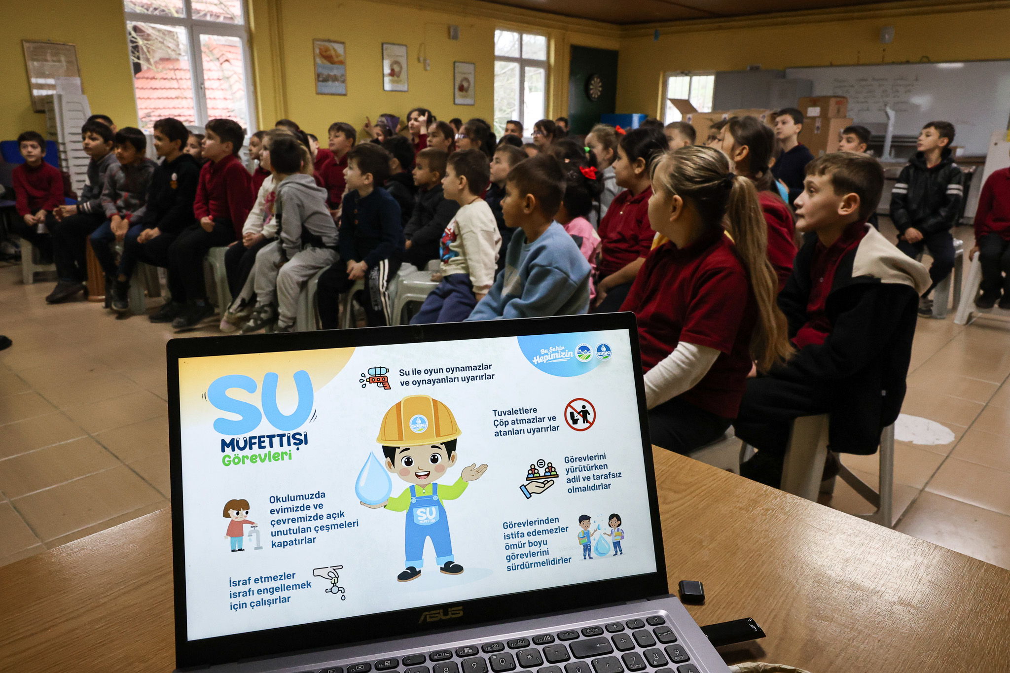 Su Müfettişi programı, miniklerin ilgisini çekecek şekilde özel olarak hazırlanan animasyon filmleri ve interaktif sunumlarla gerçekleştirildi. Suyun arıtma tesislerinde nasıl içilebilir hale getirildiğini gören öğrenciler, suyun her damlasının kıymetini izleyerek öğrendi.