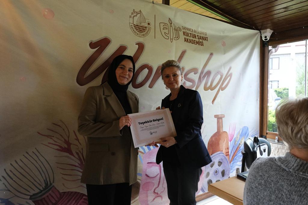 Atölye sonunda Sapanca Belediyesi Basın Yayın ve Halkla İlişkiler ile Kültür Müdürü Emine Tarım tarafından Fidan Baştan’a günün anısına teşekkür belgesi takdim edildi.