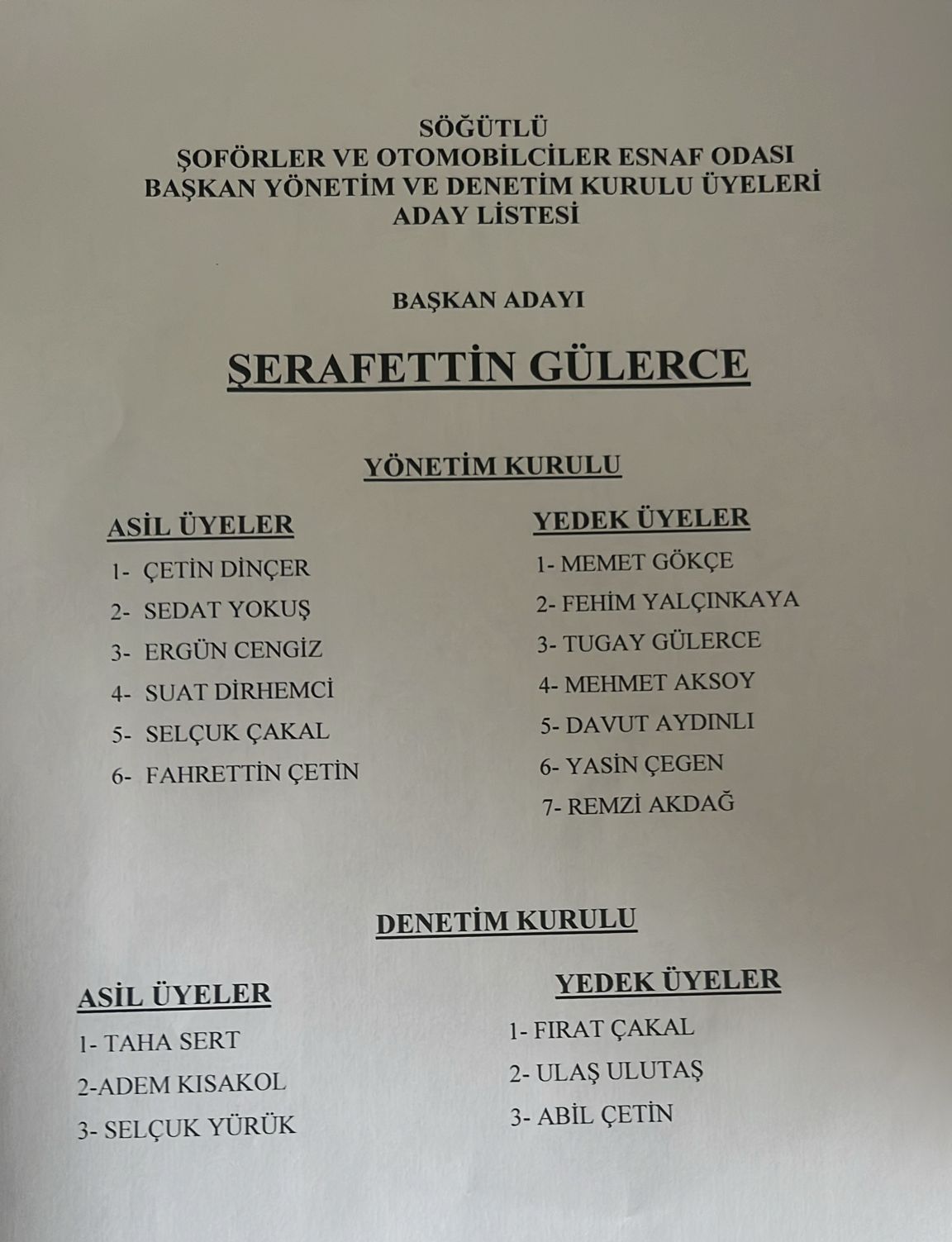 Söğütlü Şoförler ve Otomobilciler Odası Başkanlığına Şerafettin Gülerce yeniden seçildi.