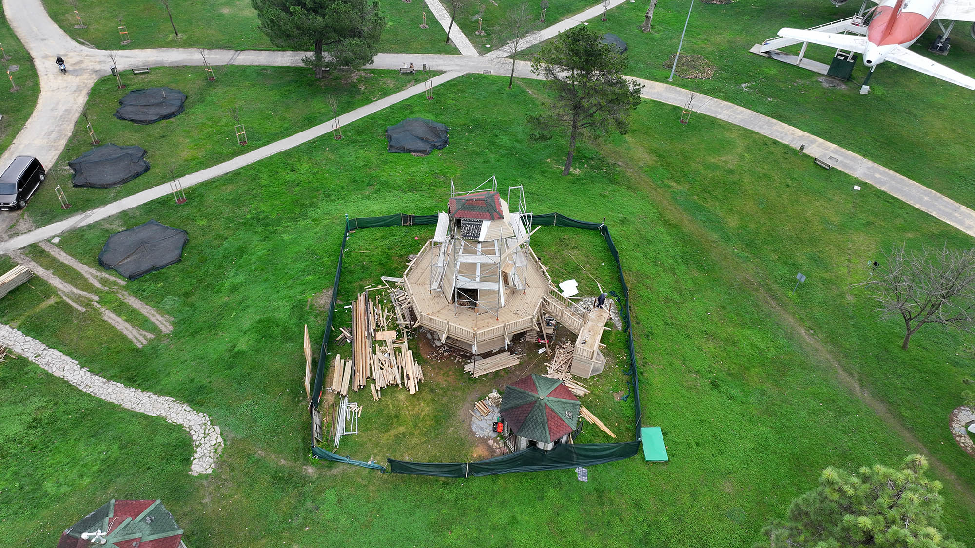 Parkın simge yapıları arasında yer alan iki noktada yürütülen restorasyon çalışmaları titizlikle devam ediyor. Yıllar içinde deformasyona uğrayan çark ve değirmen, aslına uygun şekilde yenilenerek güvenli ve estetik bir görünüme kavuşturuluyor.